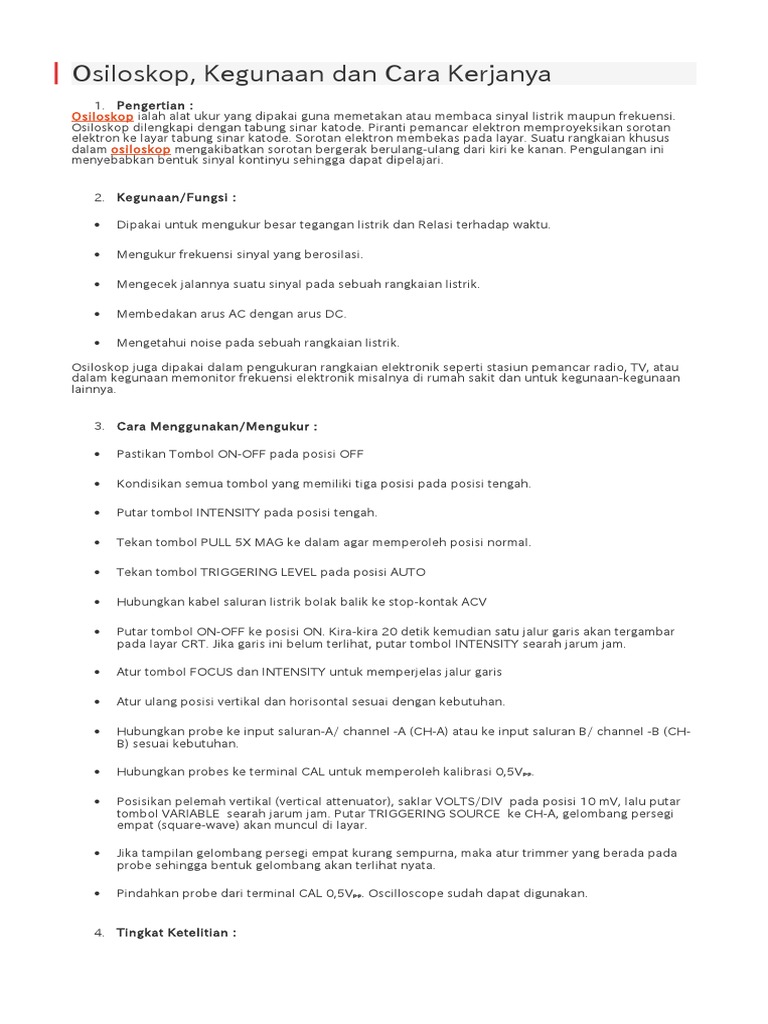 Prinsip kerja osiloskop prinsip kerja osiloskop yaitu menggunakan layar katoda. Anoda dan katoda bisa dikatakan sebagai dua istilah yang seringkali dipergunakan secara bergantian dengan positif dan negatif pada energi listrik khususnya meskipun demikian yang dipahami secara luas bahwa anoda mendapatkan namanya dari anion (ion bermuatan negatif) dan katoda. Tabung sinar katoda merupakan komponen utama jantung oasiloskop, pada dasarnya terdiri dari susunan elektroda yang dilapisi kaca bejana. 7 penembak elektron (elektron gun) berfungsi untuk membangkitkan berkas elektron dengan kecepatan yang tinggi. Jadi dengan pengertian osiloskop diatas sudah jelaskan? 5 tabung sinar katoda merupakan inti dari osiloskop berfungsi untuk menampilkan sinyal yang diamati pada layar terbuat dari gelas yang didalamnya hampa udara. Dalam osiloskop terdapat tabung panjang yang disebut tabung sinar katode atau cathode ray tube (crt). Temukan informasi lengkap tentang 511 di elvinmiradi.com. Untuk mempelajari cara penggunaan serta kegunaan osiloskop. Biasanya dibagi menjadi empat bagian yaitu layar, pengontrol vertikal, pengontrol horizontal, dan pemicu. Pengertian osiloskop adalah sebuah alat ukur elektronik yang digunakan untuk menginterpretasi atau memproyeksikan sinyal serta frekuensi listrik cara kerja osiloskop. Pada osiloskop dilengkapi dengan tabung sinar katode. Pengertian osiloskop, fungsi, jenis, karakteristik, manfaat dan cara kerja.